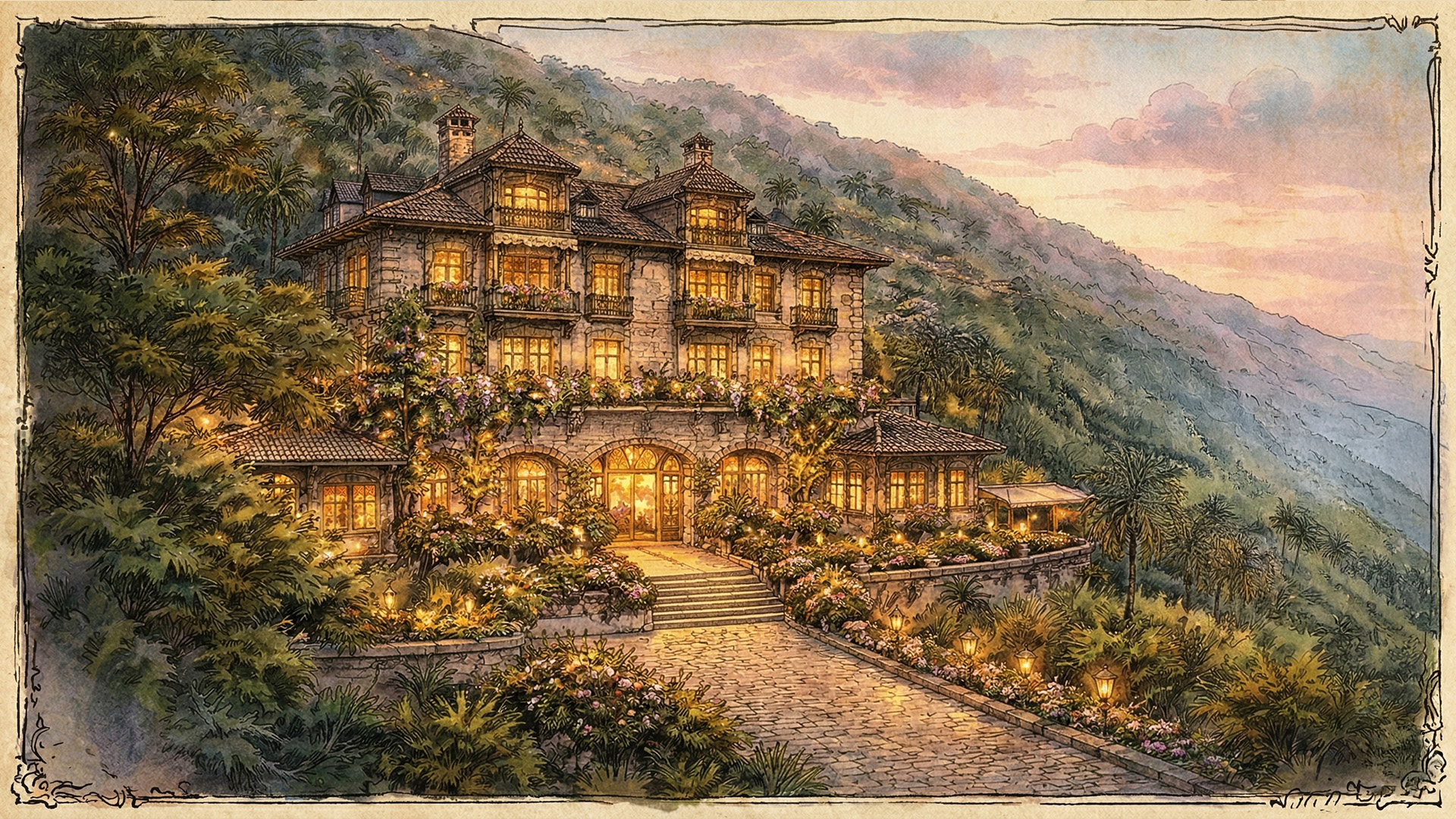 Stone pathways, lantern-lit gardens, and terraces filled with flowering plants connect the various buildings throughout the property.